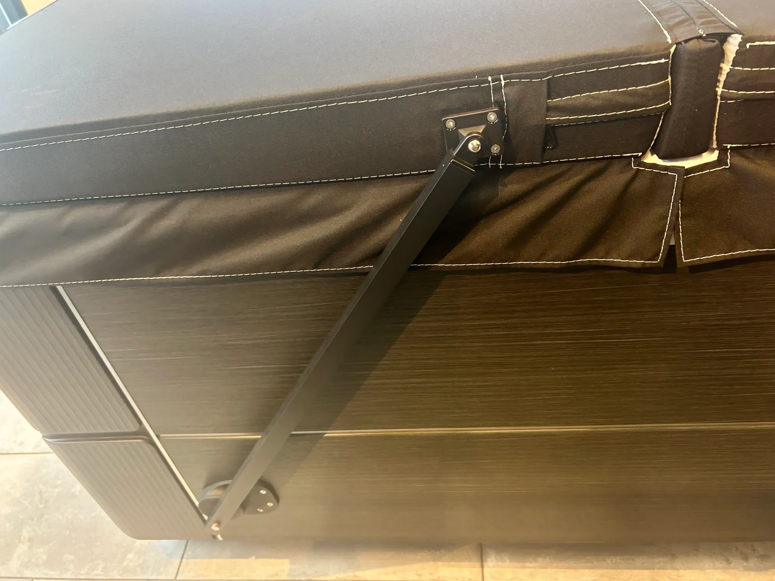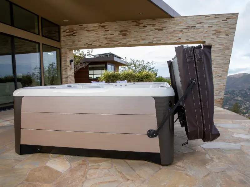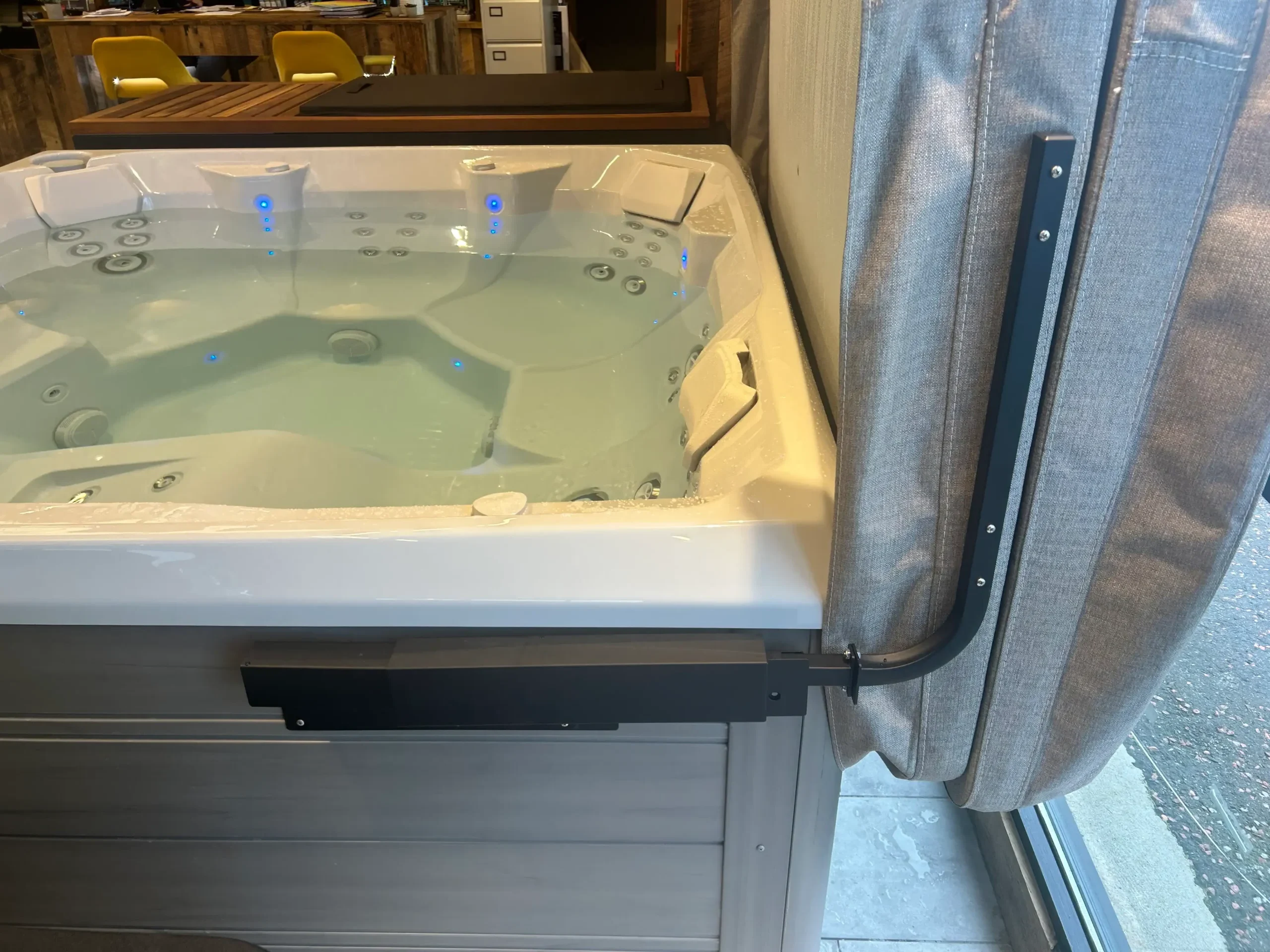 The CoverCradle® II is the next evolution of our innovative cover lifter design. Built with a single pneumatic gas spring, it allows effortless lifting and closing of your hot tub cover. Just like the original model, it requires 61 cm of space behind the spa and only 8 cm at the side for smooth operation.*